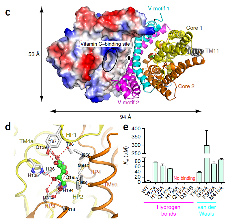 王佳伟研究组选择大肠杆菌中的UlaA蛋白作为研究对象,通过X-射线晶体衍射的方法解析出了两组不同构象的UlaA高分辨率晶体结构,衍射分别是1.65 Å和2.35 Å。在这两个已获得的结构中,UlaA都结合有底物维生素C,并以二聚体形式行使功能。解析的UlaA结构呈现出一个全新的复杂折叠方式,每个UlaA分子包含有11个跨膜结构、4个凹角类发卡结构和3个水平方向两性螺旋,分子内都包含两个反向的对称单位,一根赝对称轴平行于膜表面。每个UlaA分子可以被分成两个部分,分别被称为V motif区域和core区域,二聚化的区域主要位于蛋白的V motif区域,而底物主要由core区域的氨基酸识别与结合。比较已获得的两个结构,两个不同的二聚体一共呈现出两种不同的构象,一种构象是结合底物后保持向外开放,另一种则是结合底物后两端封闭,这两种构象代表了UlaA转运底物的两个过程,根据这两个结构我们可以推断当UlaA结合底物后先是保持向外开口,进而core区域做刚体翻转封闭两端,最后经过一系列后续过程释放底物。这个结构比对初步揭示出UlaA蛋白在维生素C转运循环中的构象变化,为理解细菌中维生素C的转运与代谢过程提供了重要的分子基础。