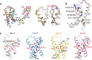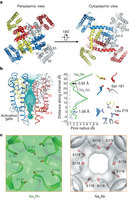 Cav1.1及其他电压门控钙离子通道是由四个亚基组成的蛋白复合体,分别为a1, a2d, b和g。其中a1亚基是钙离子通道亚基,负责运输Ca2+。它与电压门控钠离子通道(Nav)的结构相似,由一条肽链折叠成四个相似的结构域,每个结构域包含六根跨膜螺旋(S1-S6)。四组S5、S6以及他们之间的序列组成了钙离子运输通道(pore region),而每一个结构域中的S1-S4则形成电压感应器(voltage-sensing domains,VSDs)。Cav1.1的其他亚基不参与钙离子运输,但对通道的电压感受、电生理特征、以及细胞定位等有重要的调控作用,因此也被称为辅助性亚基(auxiliary subunits)。