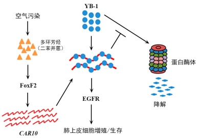 周光飚研究组研究了长链非编码RNA(lncRNA)在空气污染引起肺癌过程中的作用。通过lncRNA芯片,他们发现空气污染区肺癌样本含有更多异常表达的lncRNAs, 说明CAR10是一个空气污染相关的长链非编码RNA。多因素回归分析显示,CAR10高表达与空气污染相关。功能研究发现,多环芳烃家族的二苯并蒽通过转录因子FoxF2促进CAR10在肺上皮细胞中的表达,CAR10与转录因子YB-1结合后抑制其被蛋白酶体降解,引起YB-1蛋白的积累,促进表皮生长因子(EGFR) 的表达,进而促进细胞增殖、诱发肺癌。该研究首次揭示了空气污染可以通过调控lncRNA的表达而促进肺癌,其中CAR10在空气污染诱发肺癌中发挥重要作用。