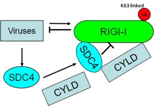 孙钦秒研究组通过酵母双杂筛选得到一个与RIG-I相互作用的蛋白SDC4。通过过表达和基因缺失实验表明:该蛋白在RLRs抗病毒天然免疫中起着负调控作用,缺失该蛋白可以有效控制VSV病毒的复制。其负调控功能在基因缺失的小鼠体内得到了很好的验证。进一步生化和细胞定位的研究表明:SDC4蛋白通过影响去泛素化酶CYLD和RIG-I相互作用以及病毒感染后的核周定位模式来调控RIG-I K63位的泛素进而参与RIG-I介导的抗病毒天然免疫反应。