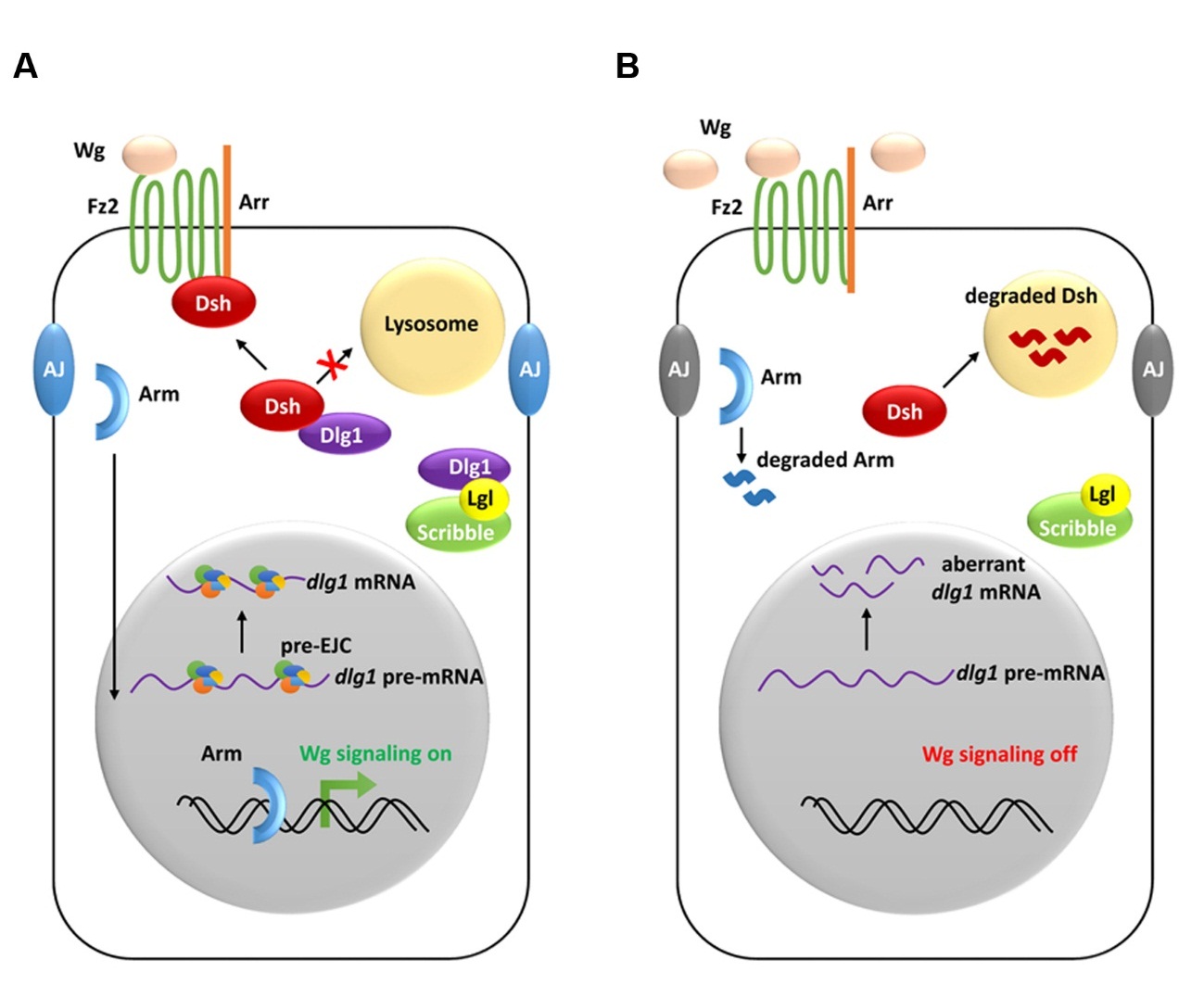 为了揭示 Wg 信号途径中的新的调控因子,朱健研究组利用果蝇的翅发育作为模型进行遗传筛选,发现 外显子接合复合体 (exon junction complex, EJC) 是 Wg/Wnt 信号转导途径的一个新的正向调控因子。EJC 已知在 mRNA 剪切和转录后水平上有着多样的调控作用,朱健研究组的研究表明其对于Wingless信号途径的激活是必须的。Wingless 信号途径的激活依赖于细胞膜表面受体复合物和胞内支架蛋白 Dsh 介导的Wg/Wnt 信号的接受。EJC 通过维持 Dsh 蛋白来确保 Wg/Wnt 信号的正确接受。果蝇翅成虫盘转录组的分析显示,EJC 调节了细胞极性基因 dlg1的 mRNA 剪切过程。遗传与生化实验的数据表明 Dlg1 蛋白通过与 Dsh 的直接相互作用来抑制溶酶体对 Dsh 的降解,从而维持 Dsh 的蛋白水平。更重要的是,Dlg1 的人源同源蛋白对于人源Dishevelled 蛋白的稳定性也有维持的作用,显示了 Dlg 和 EJC 对于 Wg/Wnt 信号转导途径的调控机制在进化上的保守性。