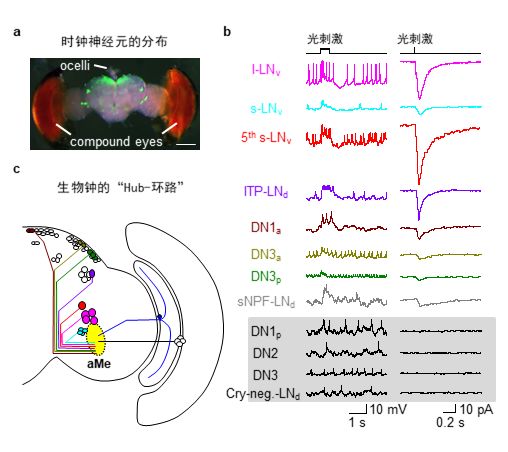 生物钟存在于各种生物体,其分子机制在果蝇和哺乳动物中高度保守;它的一个重要特征是能被环境光照调节,从而让个体的生理和行为与昼夜变化同步(如大家熟悉的时差调整)。虽然生物钟的分子机制已有深入研究(果蝇生物钟的研究获2017年诺贝尔生理或医学奖),但其与光照同步化的环路机制(及其调控生理和行为的神经机制)尚不清楚。过去几十年,生物钟被普遍认为是通过串行神经环路实现与光照的同步化。例如,哺乳动物主时钟(视交叉上核)的腹部时钟神经元和果蝇脑中的腹侧时钟神经元被认为是先接受眼睛的视觉信号。这些时钟神经元将视觉信息传递到其它时钟神经元,实现生物钟与光照的同步化。