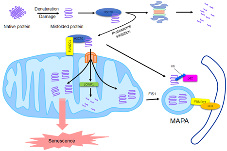 陈佺研究员课题组发现,定位于线粒体外膜的线粒体自噬受体蛋白FUNDC1能够与定位于胞浆的分子伴侣蛋白HSC70相互作用。胞浆中损伤或错误折叠的蛋白可通过该相互作用被募集到线粒体上,之后通过TOM-TIM复合体进入线粒体基质并被定位于基质的线粒体蛋白酶LONP1降解。当细胞中蛋白酶体的活性受到抑制时,FUNDC1与HSC70的相互作用增强,进入线粒体的非折叠蛋白也相应增加。如果这些蛋白在线粒体基质中不能被及时清除,则会参与形成一种特异的多层膜结构。