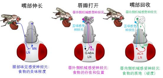 为了重构出控制这两种进食行为的神经环路,研究组发展了一种保留完整嘴部结构的离体大脑标本。利用膜片钳记录、神经元追踪技术和光遗传等方法,研究组在脑中找到了唇瓣机械感受神经元下游的两类运动神经元,发现它们和机械感受神经元间通过单突触连接形成两条不同的进食环路。此外,苦味信号可调节这两种进食行为:拮抗机械刺激引起的唇瓣打开,但促进机械刺激引起的口器缩回;这两种相反的苦味调节作用最终都引起进食的终止,从而保护个体免受有毒害的苦味食物的伤害。