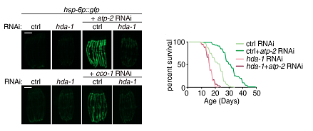 (左图)HDA-1调控线粒体未折叠蛋白反应 (右图)HDA-1调控秀丽隐杆线虫寿命
