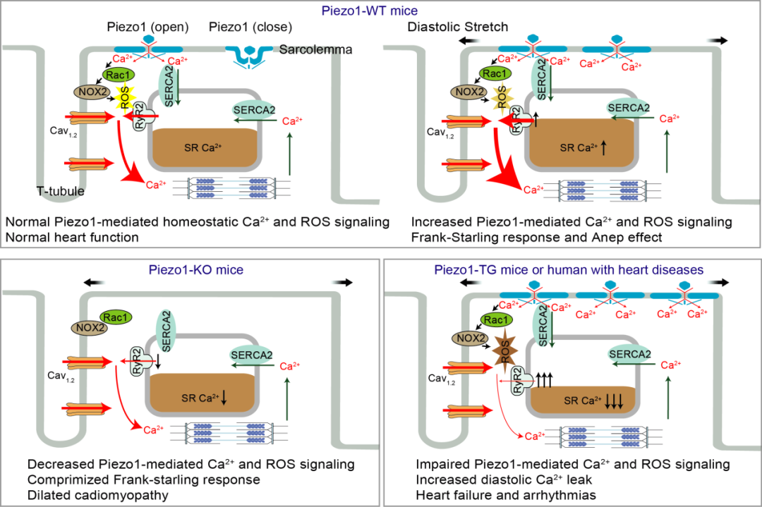 心肌细胞特异性敲除或过表达Piezo1导致钙信号和 ROS信号失调以及心脏功能障碍,证明了Piezo1可以维持心脏功能稳态。当心肌细胞受到机械力刺激,Piezo1开放引起的钙内流一方面增加肌浆网钙库的含量,并通过NOX2-ROS信号通路增强RyR2的通道活性,可导致心肌细胞在收缩期的钙反应增强从而增加心肌细胞的收缩强度,从而维持心脏正常功能稳态。敲除Piezo1导致钙内流和ROS产生的减少,从而导致肌浆网钙含量降低以及RyR2通道的敏感性降低,阻断了正反馈回路,引起心脏泵血功能下降,导致扩张型心肌病;而过表达Piezo1则引起钙内流和ROS过度产生,引起自发性肌浆网钙泄漏增加,致使肌浆网钙库大量损失,并产生可致心律失常的钙波,最终导致Piezo1过表达小鼠出现严重的心力衰竭和心律失常表型。