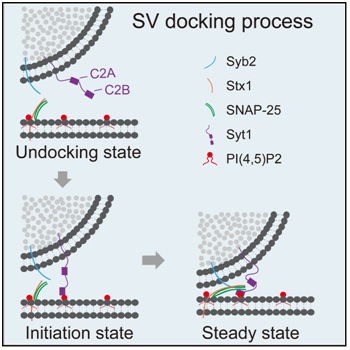 在文献报道中,Synaptotagmin-1 (Syt1)和三个SNARE蛋白形成的复合物,是介导突触小泡Docking的潜在候选分子机器。SNARE 复合物由三个蛋白组成,是囊泡与质膜融合的最小蛋白机器。Syt1则是动作电位诱发突触小泡释放的钙离子感受器。在经典的囊泡融合模型中,三个SNARE蛋白在远端结合形成一个Z字型的拉链,随着4个平行α螺旋束结构的形成,囊泡自远而近地完成了Docking-Priming的过程,进入“release ready”的状态,这是囊泡Docking的传统模型,即SNARE complex介导了囊泡的Docking。然而,这一模型存在较大争议,原因在于两方面。一方面,Docking的形态学定义(即囊泡须紧贴于质膜)并不准确,Docking究竟在什么位置启动,一直是悬而未决的问题。另一方面,在蛋白机器研究上,多重基因敲除动物模型不但耗时耗力,而且存在很多发育缺陷与代偿作用带来的负面效应。