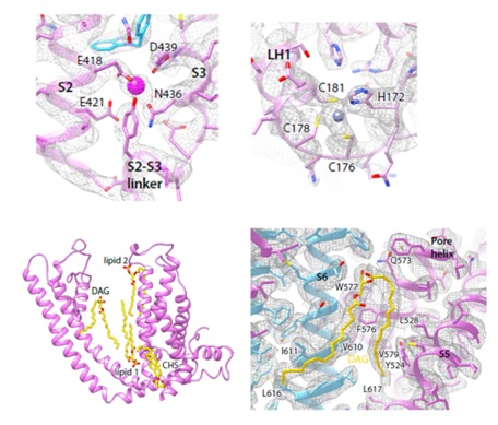 在跨膜区有数个脂类/去垢剂结合位点(图4)。在结合CMZ的TRPC5电子密度图中,在跨膜螺旋S5和S6之间观察到了类似DAG的密度。HPLC-MS实验也证明蛋白样品中含有DAG。在结合HC-070的TRPC5电子密度图中,DAG头部的密度被HC-070替代了,而两条脂肪链尾巴的密度却还保留着。