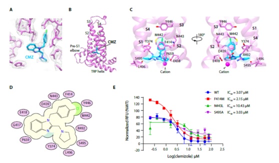 CMZ结合在跨膜区的由跨膜螺旋S1-S4组成的电压传感器样结构域(VSLD)(图2)。与CMZ距离近的氨基酸中,F414与CMZ的氯苯环形成π-π堆积作用;Y374,M442,Y446和P659与CMZ形成疏水相互作用(图2)。功能实验结果显示,将N443突变成TRPC3/6上对应的氨基酸亮氨酸后,CMZ的抑制效力明显减弱(图2),说明N443对于CMZ发挥抑制作用很重要,也解释了CMZ对于TRPC不同亚型的选择作用。