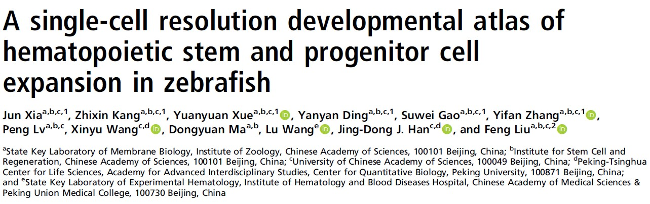 2021年3月30日,动物研究所刘峰研究组在PNAS杂志上发表题为“A single-cell resolution developmental atlas of hematopoietic stem and progenitor cell expansion in zebrafish”的研究论文。该研究描绘了扩增性造血组织的动态单细胞发育图谱,深入解析了造血干细胞扩增的细胞基础和分子机制。