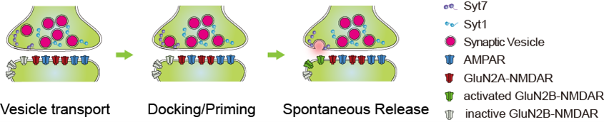 随后,作者探究了Syt7的这一功能的生理意义。在作者的前期研究中,已经发现Syt7处于突触前活性带的边缘区域,其介导的谷氨酸释放通过专一性激活突触后同样处于边缘区域的GluN2B-NMDAR,是BD发生的一个重要原因。因此,作者进一步检测了Syt7介导的自发释放,发现和其它两类钙感受蛋白激发的自发释放相比,Syt7诱发的释放可以特异性激活GluN2B-NMDAR,从而可能参与精神疾病的发生。