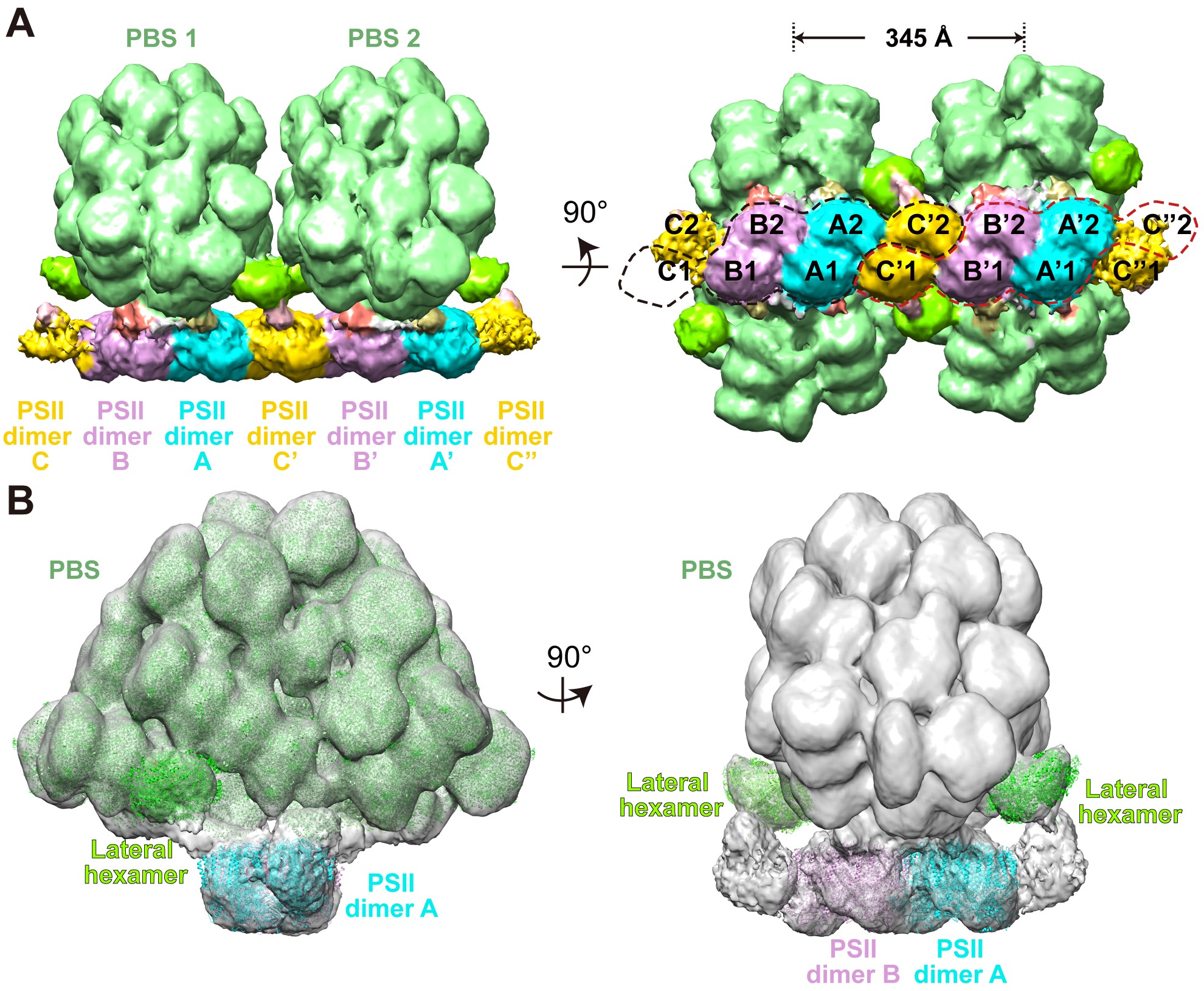 图:PBS-PSII 超复合物和double PBS-PSII 超复合物的整体结构