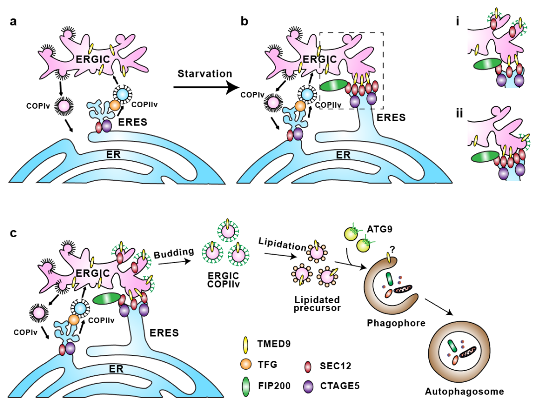 该工作发现了ERGIC关键蛋白TMED9作为自噬调控因子调节新型内膜ERGIC-ERES互作,在自噬体产生中其重要作用,解答了以上两个重要问题。结合先前的一系列工作,作者提出了一个TMED9介导的ERGIC-ERES新型膜互作促进自噬体形成的分子通路。其中,饥饿刺激通过影响SEC12与FIP200以及CTAGE5的互作导致ERES重塑。ERES重塑促进TMED9与SEC12的结合,直接介导了ERGIC-ERES膜互作的形成,可以为SEC12从ERES到ERGIC的转移提供便利条件,而且由于接触非常紧密,位于ERES上的SEC12可以直接反式激活ERGIC上COPII的产生。通过以上两种方式,ERGIC可以在饥饿等胁迫条件下产生COPII自噬小泡,为自噬体的形成提供充足膜来源(图3)。