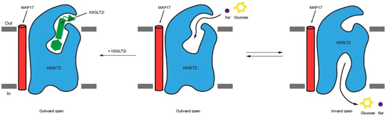 综上所述,作者通过冷冻电镜对SGLT2-MAP17复合物和抑制剂的结构进行解析,发现抑制剂将SGLT2锁定在向外开放状态,确定了SGLT2抑制剂的结合位点,阐释了抑制剂抑制SGLT2的工作机制(图4),为SGLT家族抑制剂的进一步优化提供了结构基础。