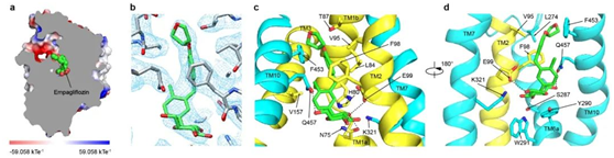 抑制剂恩格列净结合在SGLT2蛋白的中间,抑制剂的葡萄糖基占据了葡萄糖的结合位点,葡萄糖基的羟基与SGLT2的氨基酸发生了极性相互作用。抑制剂的糖苷配基从葡萄糖结合位点往外延伸,直到蛋白外侧,将SGLT2锁定在向外开放状态(outward-open)(图3)。抑制剂的氯苯基和SGLT2的H80相互作用,中间的苯基与SGLT2的F98、V95、L84和F453通过疏水相互作用,末端的四氢呋喃基团和SGLT2的F98、L274氨基酸相互作用(图3)。作者将SGLT2的F98和F453分别突变为丙氨酸发现,突变的SGLT2降低了和抑制剂的结合,减弱了抑制剂的抑制作用。此外,作者还将和抑制剂结合的SGLT2氨基酸突变为SGLT1对应的氨基酸,发现抑制剂的抑制效果也减弱。这在一定程度上解释了恩格列净对SGLT2相较于SGLT1的高选择性。