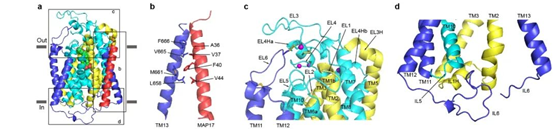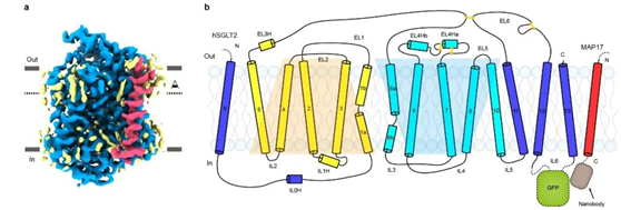 图1. SGLT2-MAP17蛋白的电子密度图和拓扑示意图