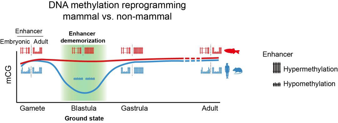 哺乳动物和非哺乳动物分别利用DNA甲基化整体擦除重建以及维持高DNA甲基化并实现增强子去记忆化擦除亲本表观遗传记忆和重置发育时钟