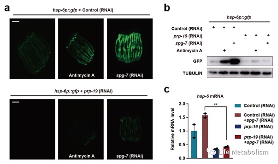 (a:Antimycin A处理或spg-7 RNAi导致的线粒体胁迫都能激活UPRmt,诱导hsp-6p::gfp的表达。而prp-19 RNAi处理组的线虫中UPRmt激活被抑制。hsp-6p::gfp:秀丽隐杆线虫UPRmt荧光报告株系;抗霉素A(Antimycin A):线粒体电子传递链复合物II抑制剂;spg-7:编码线粒体AAA金属蛋白酶。b:Western blot检测hsp-6p::gfp线虫在不同条件下的GFP蛋白表达水平;c:QPCR检测线虫内源hsp-6在四种不同条件下的mRNA水平变化。)