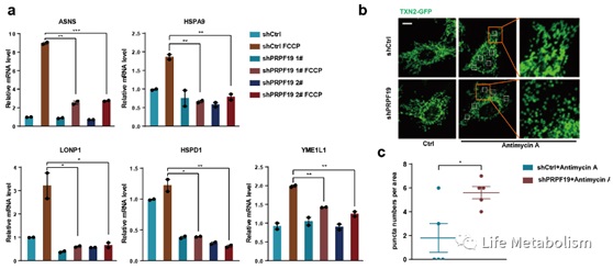在HEK293T细在HEK293T细胞中,该研究团队利用线粒体氧化磷酸化解偶联剂FCCP诱导细胞中UPRmt的激活,并检测内源UPRmt相关基因在shPRPF19和对照条件下的表达水平变化。结果显示FCCP处理条件下,shPRPF19处理组的细胞中内源ASNA,HSPA9,LONP1,HSPD1和YME1L1这些UPRmt相关基因的表达水平显著低于对照组细胞,说明在HEK293T细胞中,PRPF19的敲低同样能够抑制UPRmt的激活。此外,该研究团队构建了线粒体硫氧还原蛋白融合绿色荧光蛋白表达的TXN2-GFP稳定表达HeLa细胞株系用于观察线粒体形态,在Antimycin A处理导致的线粒体胁迫下,细胞的线粒体发生明显的形态变化,对照组细胞中的线粒体多呈现短棒状形态,而在shPRPF19处理组的HeLa细胞中,线粒体多呈点状(puncta),说明shPRPF19处理条件下的细胞表现出对线粒体损伤更弱的耐受性和调节能力。以上结果说明PRPF19在人源细胞中同样参与调控UPRmt的激活,并在线粒体损伤条件下起到重要的保护作用。