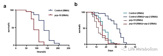 (a:分别在对照组和prp-19 RNAi处理条件下且都暴露于绿脓杆菌环境中的线虫的生存曲线;b:图示四种不同处理条件下的线虫的生存曲线,atp-2:编码线粒体ATP合酶亚基)