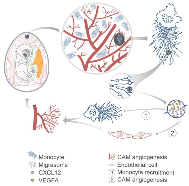 2022年11月28日,俞立教授团队在Nature Cell Biology上发表文章Monocytes deposit migrasomes to promote embryonic angiogenesis,在这项研究中,研究者观察到鸡胚绒毛尿囊膜(CAM)上存在一群高度迁移的细胞,并大量形成迁移体(图一)。通过单细胞测序和抗体染色,发现这群高度迁移的细胞是单核细胞。去除单核细胞导致毛细血管形成受损,这表明这些细胞在血管新生中起重要作用。进一步的机制研究表明单核细胞产生的迁移体能够在体内、外模型中诱导血管新生。在鸡胚绒毛尿囊膜中敲低或敲除TSPAN4可阻断单核细胞迁移体的形成, 并导致毛细血管新生的抑制。有意思的是,单核细胞产生的迁移体可以在体外和体内募集单核细胞,敲低或敲除TSPAN4显著减少了毛细血管形成区域中的单核细胞数量。研究者进一步发现迁移体促进血管新生的机制是迁移体高度富集VEGFA和CXCL12。迁移体分别通过释放CXCL12和VEGFA来募集单核细胞和促进血管新生。