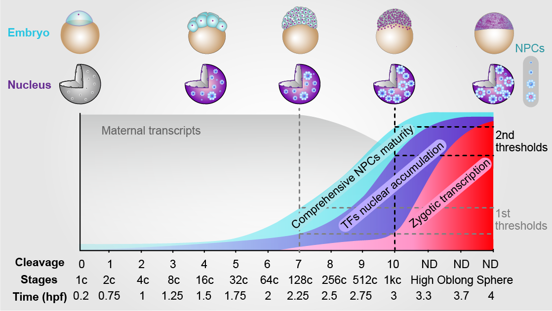 目前合子基因组激活的调控机制主要存在两种模型:核质比模型和母源时钟模型。前者认为,随着胚胎发育,细胞中的转录抑制因子逐渐稀释,当稀释到一定浓度时失去抑制作用,合子基因的转录就启动。后者认为,早期胚胎细胞中的转录因子量太低,不足以启动合子基因转录,随着发育,其量逐渐增加,直到某个时间点达到启动合子基因转录的阈值。斑马鱼母源转录因子如Nanog、Pou5f1、Sox19b和Eomesa等是启动合子基因组转录的关键转录因子,它们在受精卵中就已大量存在,现有的理论难以解释其延迟启动ZGA的事实。核孔复合体做为各种转录因子转运入核的共同通道,其变化可广泛影响不同转录因子的入核,因而可能是ZGA发生的潜在调控因素。