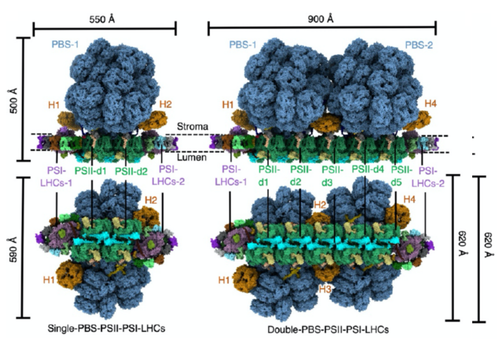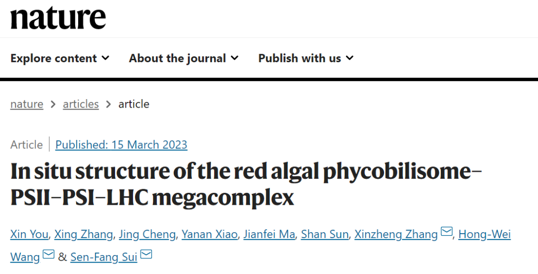 2023年3月15日,清华大学生命科学学院、北京市结构生物学高精尖创新中心和北京生物结构前沿研究中心隋森芳院士和王宏伟教授以及中科院生物物理研究所章新政研究员在Nature杂志上联合发表题为“红藻藻胆体-光系统II-光系统I-捕光复合物超大复合体的原位结构”In situ structure of the red algal phycobilisome-PSII-PSI-LHC megacomplex 的文章,为阐明细胞内天然状态下 PBS-PSII-PSI-LHC超大复合体的组装机制,以及能量从PBS 向PSII和PSI的高效转移的机制奠定了坚实的结构基础,是光合领域里的一个里程碑成果。