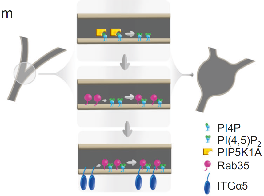 一旦积累,PI(4,5)P2通过与Rab35的c端多碱性簇相互作用将Rab35招募到迁移体形成位点。该研究进一步证明,活性Rab35通过在迁移体形成位点募集和聚集整合素α5来促进迁移体的形成,这可能是由整合素α5和Rab35之间的相互作用介导的。该项研究确定了协调迁移体生物发生的上游信号事件。