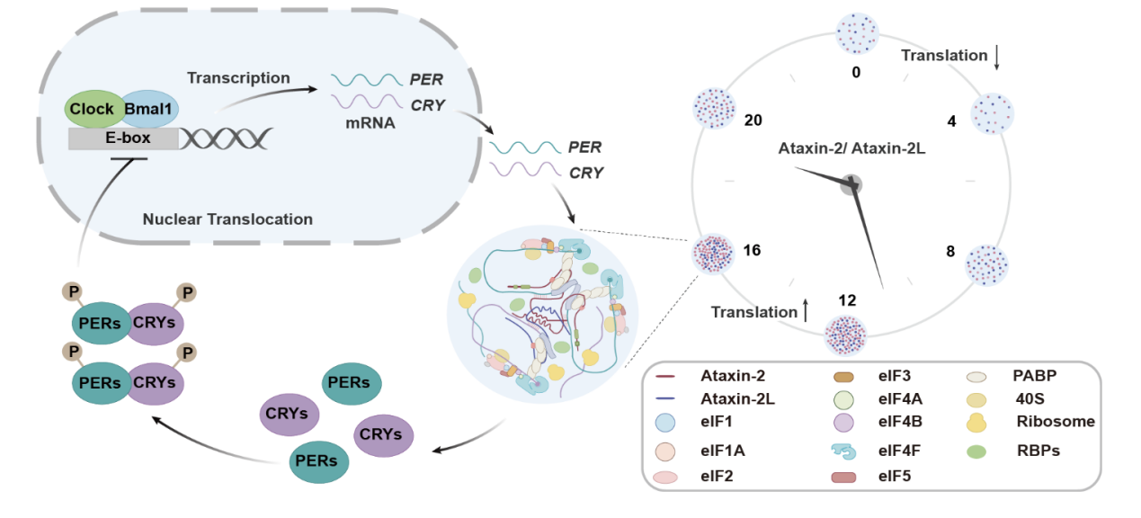 图5 ATXN2/2L相分离调控节律性蛋白翻译的分子机制模型图