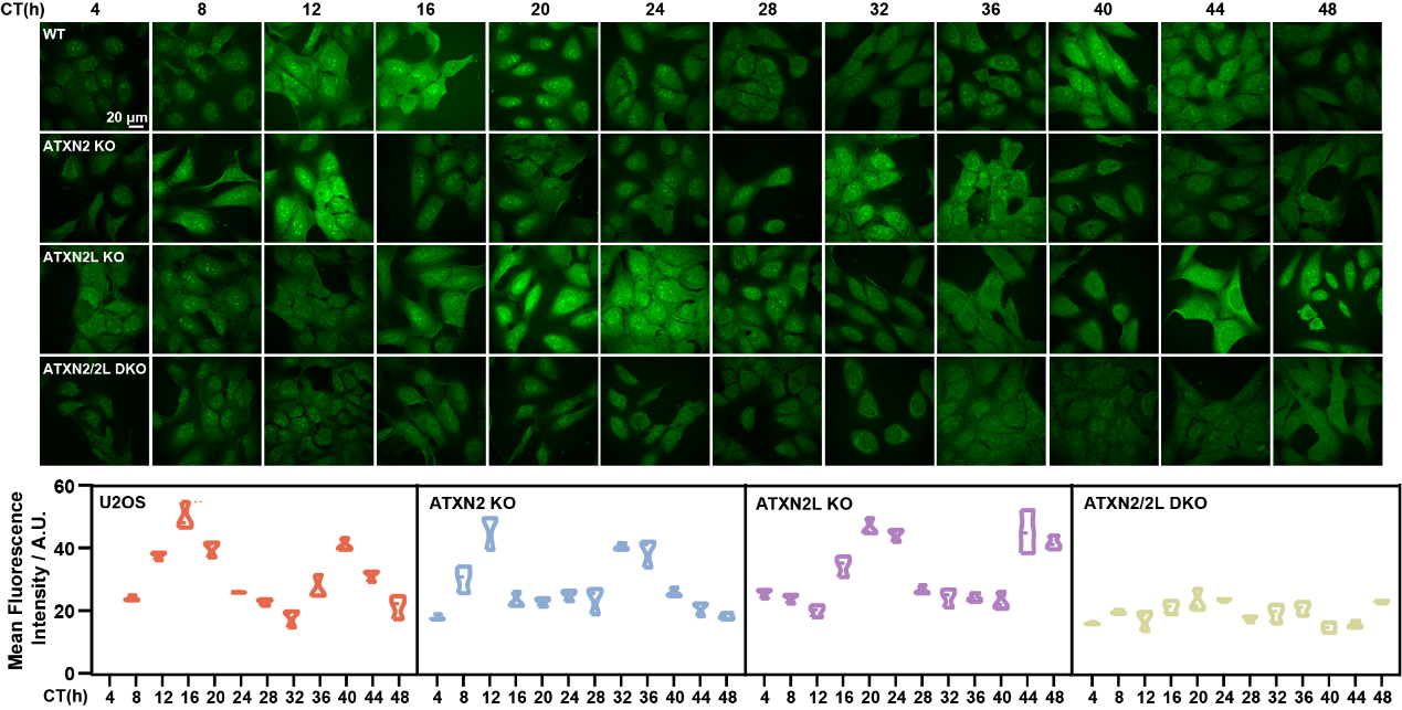 图2 ATXN2/2L凝聚体大小及数量在U2OS细胞中随昼夜节律振荡