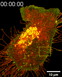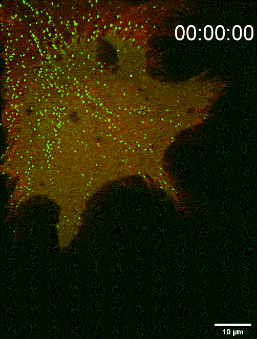 图一:SMS2-GFP亮点锚定在细胞底部后可生长成迁移体(Confocal Imaging)