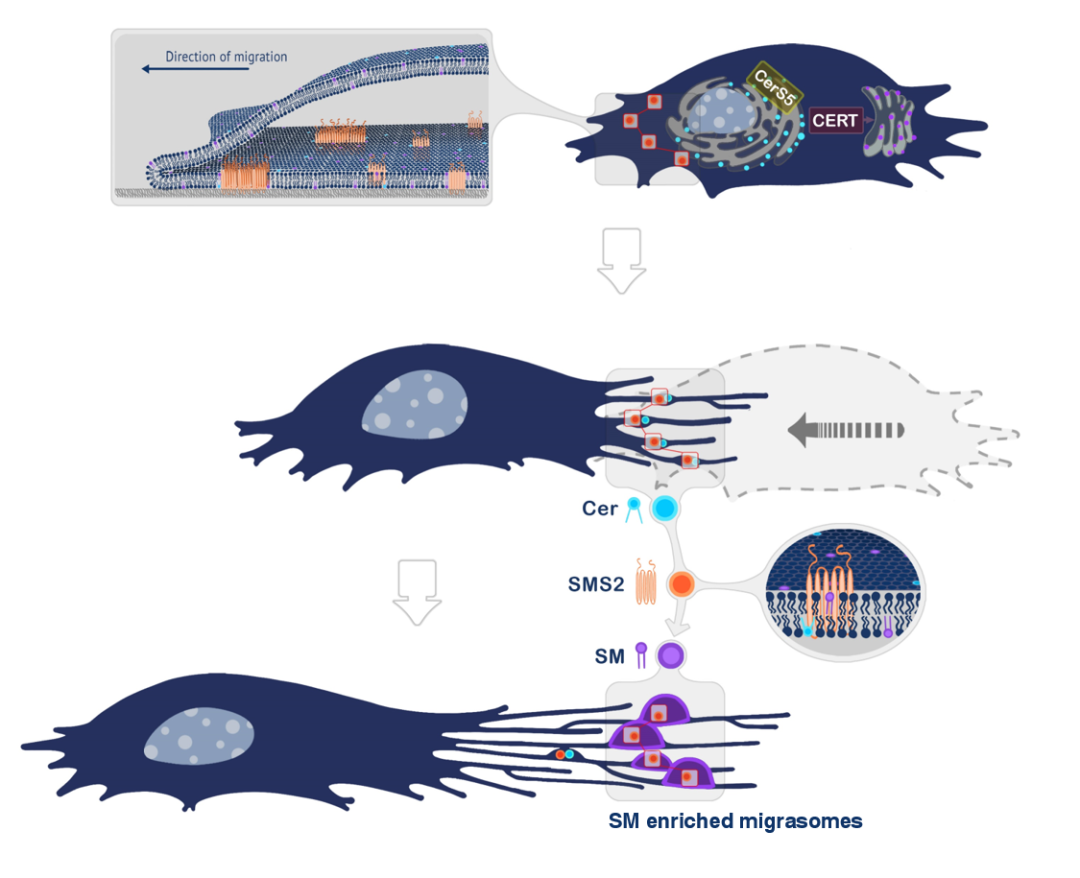 鞘磷脂合成酶 SMS2能够通过介导鞘磷脂 (SM) 合成,调控迁移体生成与结构稳定,故研究人员对鞘磷脂合成酶 SMS2展开了进一步的研究,发现:SMS2蛋白在细胞前沿的,与胞外基质接触侧的细胞膜上能组装形成SMS2斑点,这些斑点决定迁移体的发生位点。迁移体的生成也需要SMS2蛋白组装形成SMS2斑点。