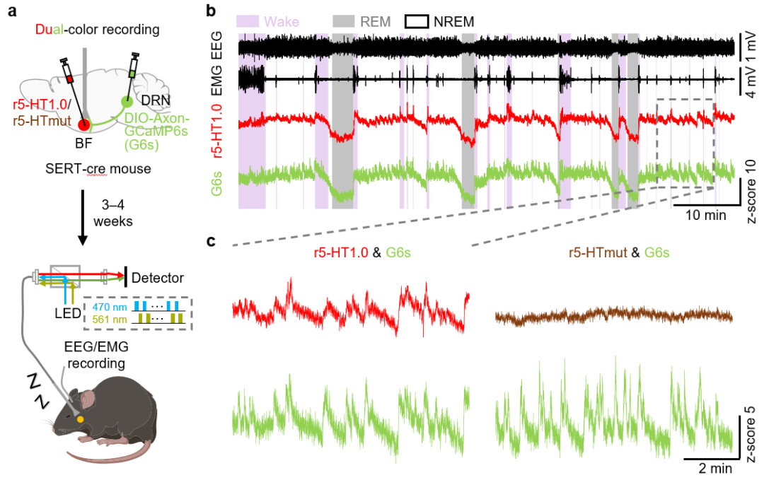 五羟色胺(5-HydroxyTryptamine,5-HT)也被称作血清素(serotonin),是一种重要的单胺类信号分子,参与多种生理功能的调节。在中枢神经系统中,5-HT信号的失调与多种脑部疾病相关,如抑郁症、焦虑、成瘾、偏头痛和癫痫等。目前,多种治疗精神疾病的药物靶向5-HT能系统,如5-HT再摄取抑制剂“百忧解”(fluoxetine,氟西汀)已被广泛用于治疗抑郁症。在活体动物中对5-HT动态变化的高时空分辨率检测对深入理解5-HT能系统在各种生理病理过程中的调控规律具有重要意义。