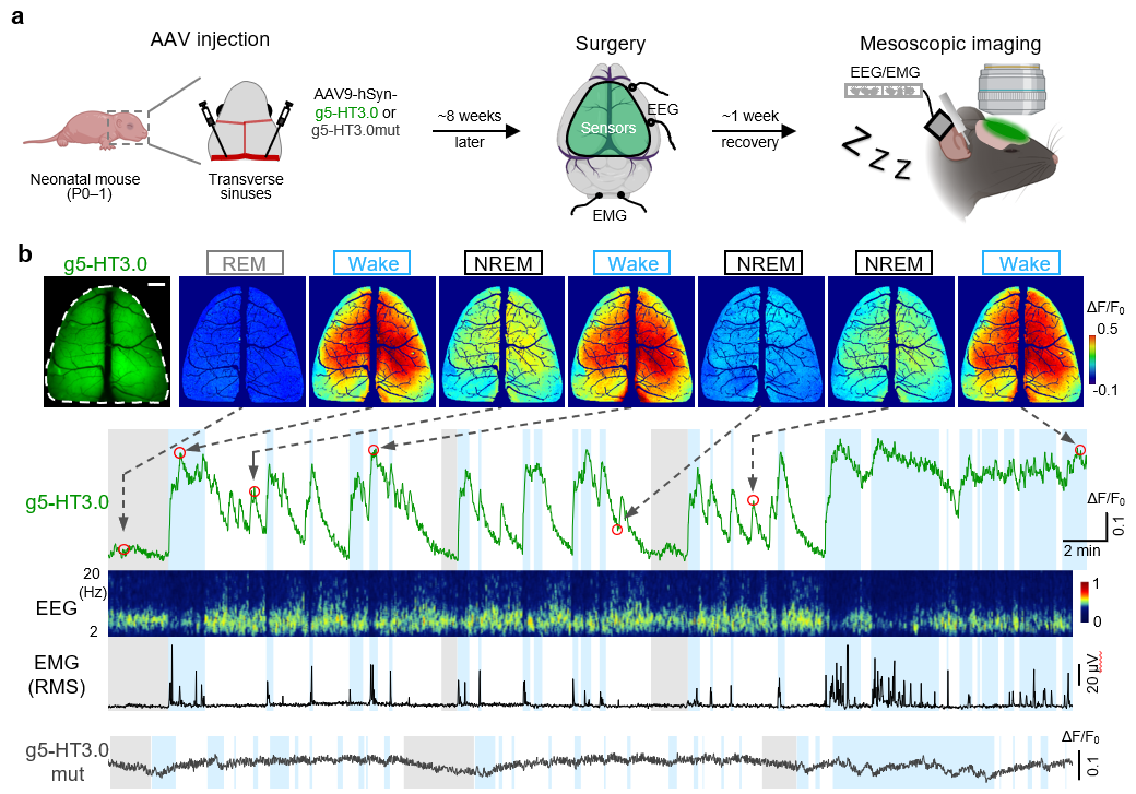 图3. 睡眠觉醒周期小鼠背侧皮层5-HT的时空动态