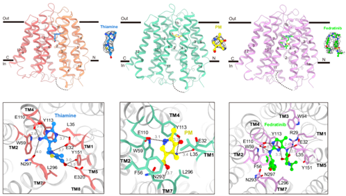 2024年3月19日,张哲课题组在Cell Research杂志发表了题为“SLC19A3的底物与药物识别机制”(Substrates and drug recognition mechanisms of SLC19A3)的研究论文。该项工作报道了人源SLC19A3蛋白分别与硫胺素(Thiamine)、吡哆胺(Pyridoxamine)、以及临床药物菲卓替尼(Fedratinib)结合的冷冻电镜结构。结合分子动力学模拟、同位素底物转运实验和亲和力定量分析,本研究阐明了人源SLC19A3蛋白识别底物和药物的分子机制。