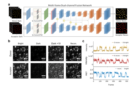 本研究提出了一种被称为“多帧双通道融合去噪网络(MUFFLE)” 深度学习的信号重建策略,其结构包括bi-ConvLSTM、U-net CNN和Dual-chanel Residual Fusion模块,充分利用单分子FRET视频数据在时间、空间和光谱层面的冗余信息,通过对视频弱信号进行增强和去噪,实现了在每帧仅需60-70个光子的极弱单分子荧光条件下,进行长时程的单分子FRET测量(图1)。