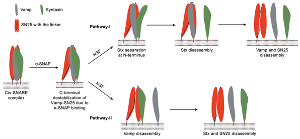 图1. NSF解聚SNARE复合体的两条主要路径示意图