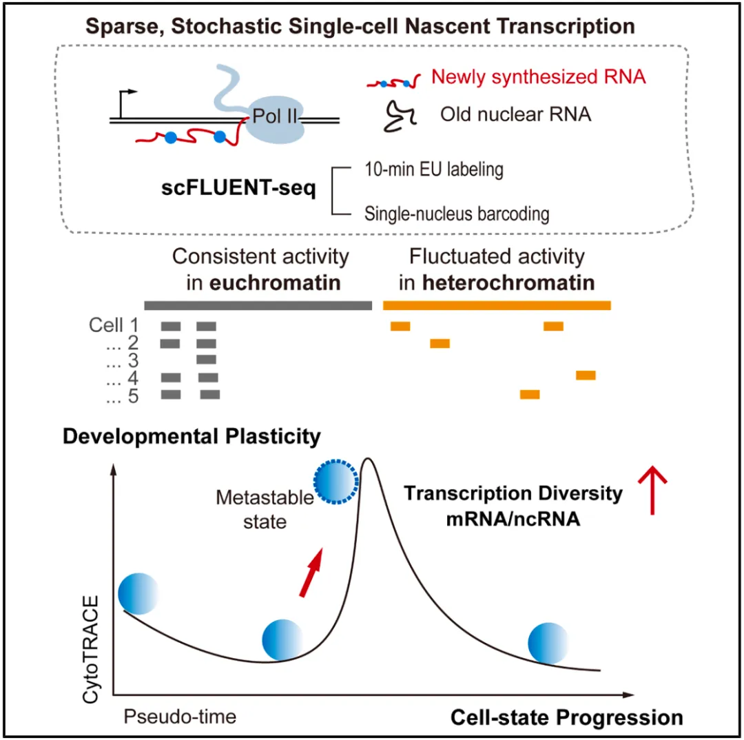 新生 RNA 的分析对于揭示基因间非编码转录以及理解基因组调控至关重要。在单个细胞中,转录本质上是随机的——这一特性会影响发育过程中的细胞命运决定。然而,这种转录多样性仍知之甚少,部分原因在于技术限制。单细胞水平的转录动力学解析对于理解如何通过解读相同的基因组来产生多样化的细胞身份至关重要。
