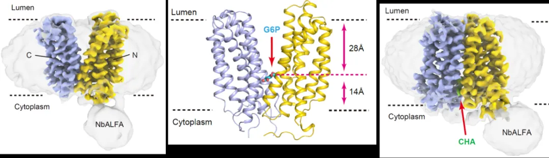 图1 人源G6PT冷冻电镜结构(G6PT-apo,G6PT-G6P,G6PT-CHA)